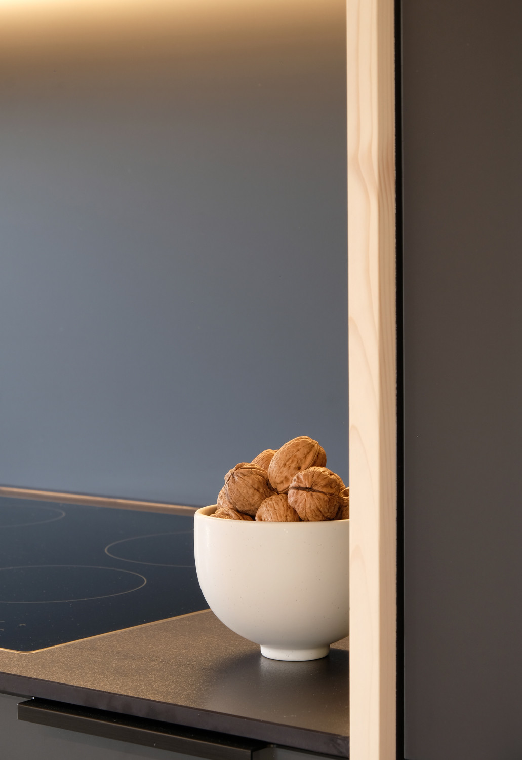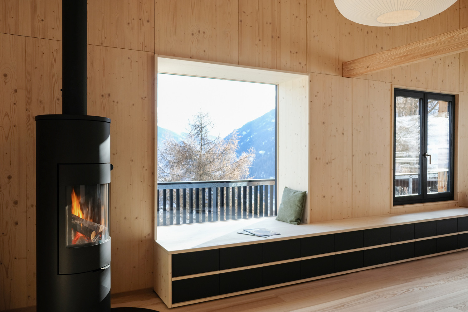 Ein zentrales architektonisches Element bildet das Sitzfenster mit durchgehender Bank entlang der Fassade. In unmittelbarer Nähe zum Cheminée positioniert, verbindet es Innenraumqualität mit dem Panoramaausblick ins Tal.