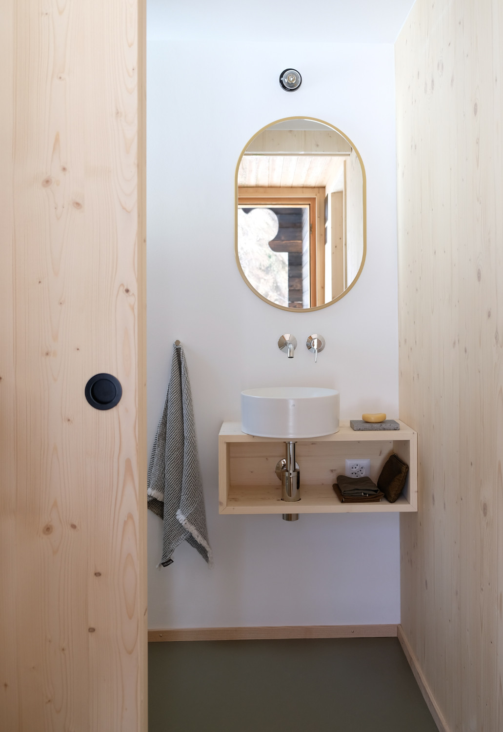 Die bestehende Raumstruktur blieb erhalten. Charakteristische Elemente wie die Täferdecke im Obergeschoss, einzelne Täferwände in den Schlafzimmern sowie die Holztreppe wurden durch Sandstrahlen aufgefrischt und in ihrer Materialität hervorgehoben. Ergänzend dazu wurden die Küche und die Nasszellen neu gestaltet und mit massgefertigten Einbaumöbeln wie Garderoben und Schränken ergänzt.
