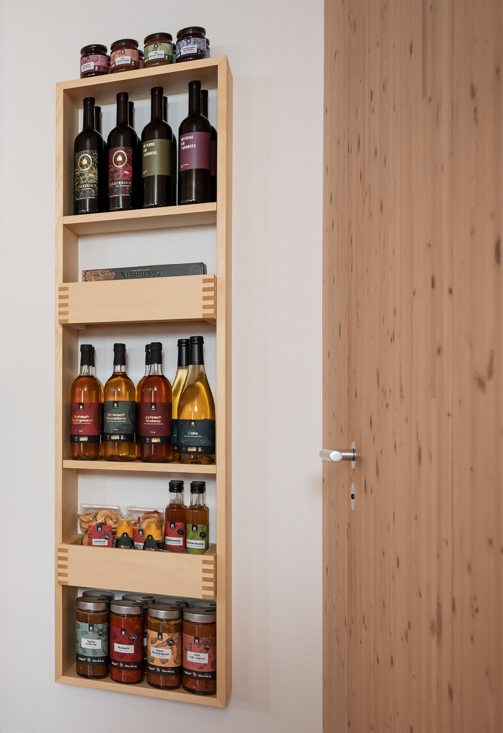 Ein besonderer Hingucker ist der Mini-Kiosk in jeder Wohnung: Er wird mit Produkten des Archehofs bestückt und ermöglicht den Gästen, sich während ihres Aufenthalts direkt vor Ort zu bedienen. Das dafür entworfene Wandregal wurde vom örtlichen Schreiner gefertigt und lässt sich flexibel an Grösse und Art der Produkte anpassen. Ergänzend entstanden zwei weitere massgefertigte Möbelstücke, die praktischen Stauraum für Lebensmittel, Broschüren und Küchenutensilien bieten, für die in der kleinen Küche sonst kein Platz wäre.