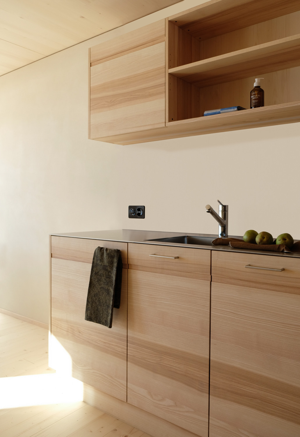 Durch die Wahl natürlicher Materialien entsteht eine Bauweise, die Nachhaltigkeit und hohen Wohnkomfort verbindet. Hervorzuheben sind die Küchen und Möbel, die leimfrei sind und aus einheimischem Mondholz entstanden. Die Umsetzung erfolgte in Zusammenarbeit mit Schmidlin Holzbau, Steinen.
