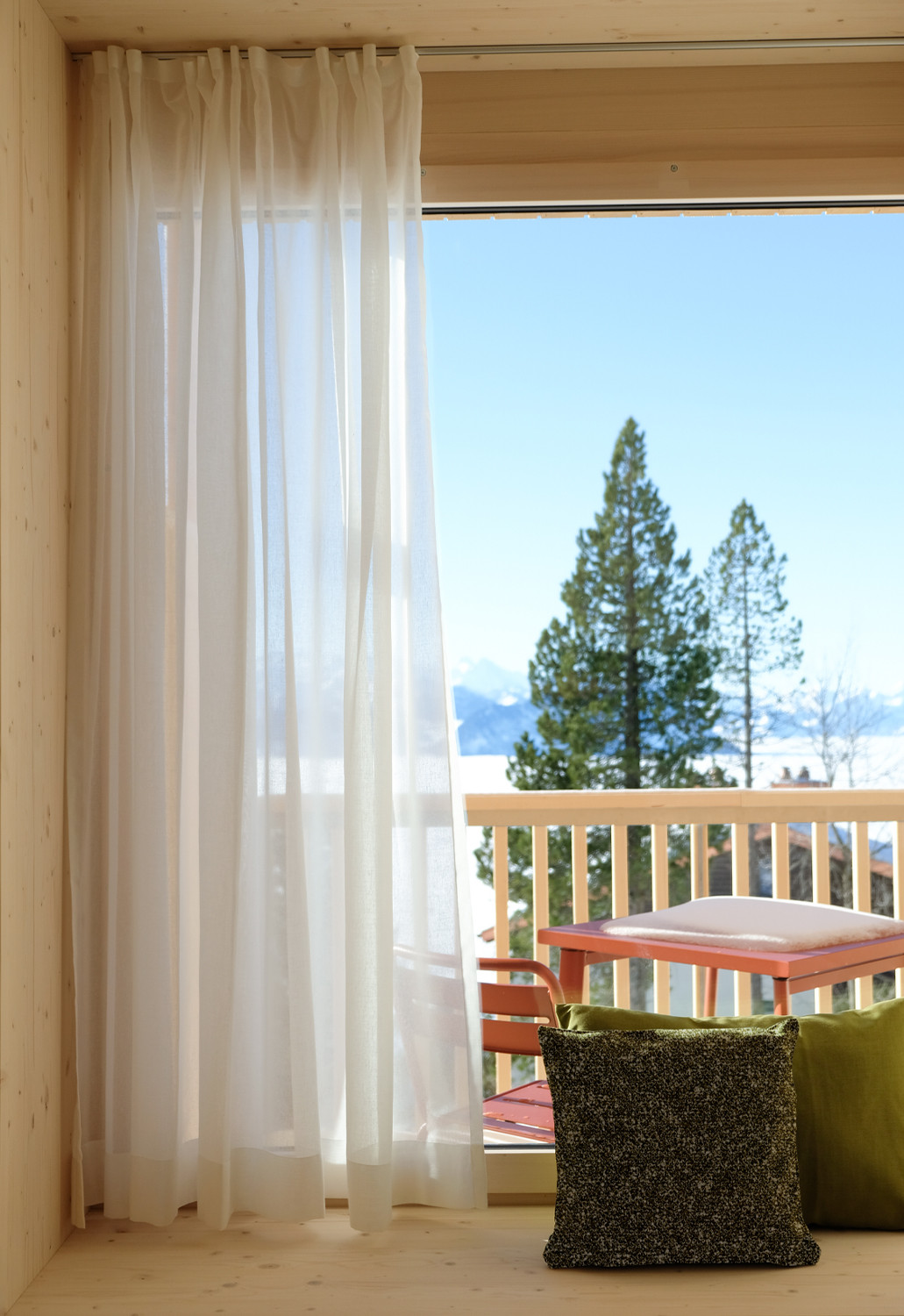 Auf Rigi First auf 1’400 m ü. M. wurden Ende 2024 vier 2,5-Zimmer- und fünf 4,5-Zimmer-Maisonettewohnungen realisiert, die seit Anfang 2025 als Ferienwohnungen vermietet werden. Das Projekt basiert auf ökologischen Grundsätzen: gebaut aus einheimischem Holz, gedämmt mit Stroh und im Innenraum mit Lehm verputzt.