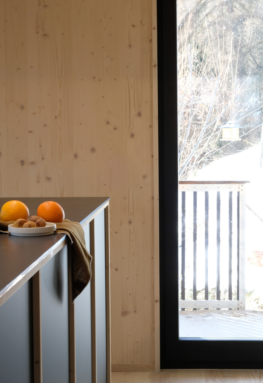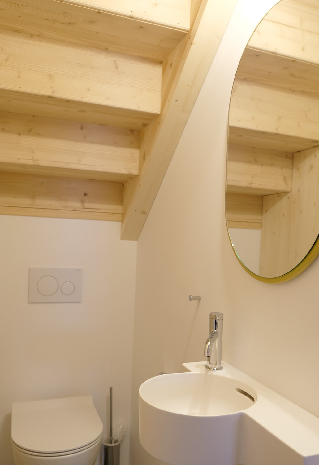 Die bestehende Raumstruktur blieb erhalten. Charakteristische Elemente wie die Täferdecke im Obergeschoss, einzelne Täferwände in den Schlafzimmern sowie die Holztreppe wurden durch Sandstrahlen aufgefrischt und in ihrer Materialität hervorgehoben. Ergänzend dazu wurden die Küche und die Nasszellen neu gestaltet und mit massgefertigten Einbaumöbeln wie Garderoben und Schränken ergänzt.